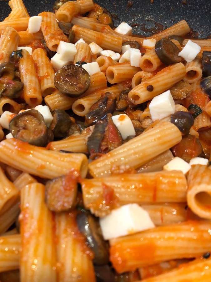 • Maak een eenvoudige saus en laat deze ongeveer 30 minuten langzaam koken. Ondertussen zijn de aubergines gaar, zet het vuur uit en wacht tot de saus ook gaar is, voeg de aubergines toe aan de saus en blijf op laag vuur verder koken. Breng op smaak met zout. Zet een pan met ruim water op het gas om de pasta te koken, zodra het kookt, voeg zout toe en doe de rigatoni erin. Wanneer de pasta nog een paar minuten nodig heeft om gaar te worden, voeg hem toe aan de saus, voeg een beetje kookvocht toe en maak het gerecht af. Zet het gas uit en voeg de in blokjes gesneden mozzarella, grof gesneden basilicum toe en laat een paar minuten rusten. Serveer meteen!