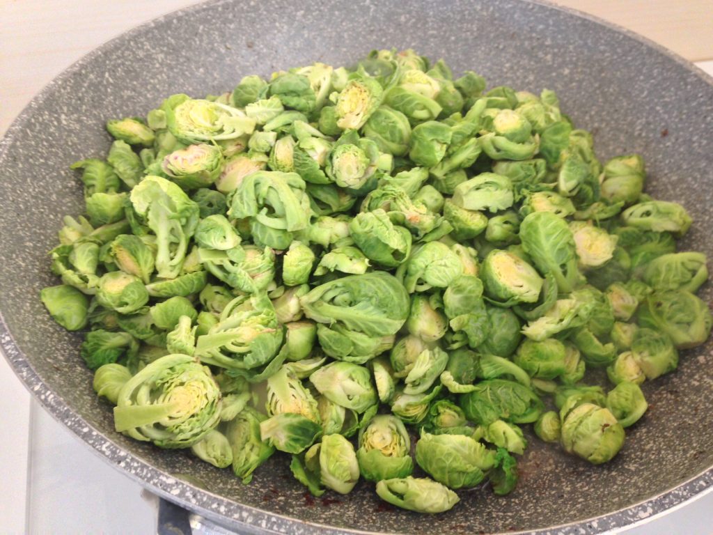 Halveer de spruiten en voeg ze toe aan de pan waarin je het spek hebt gebakken. Voeg een eetlepel extra vergine olijfolie toe, breng op smaak met zout en peper en bak de spruitjes goed aan terwijl je ze vaak omdraait. Zodra ze slap worden, voeg je lauwwarm water toe tot de spruiten bijna bedekt zijn en laat je ze koken tot al het water is opgenomen.