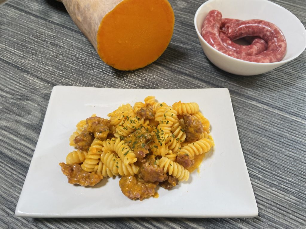 FUSILLI MET ROMIGE POMPOEN EN WORST zijn een hoofdgerecht met een krachtige en smaakvolle smaak.