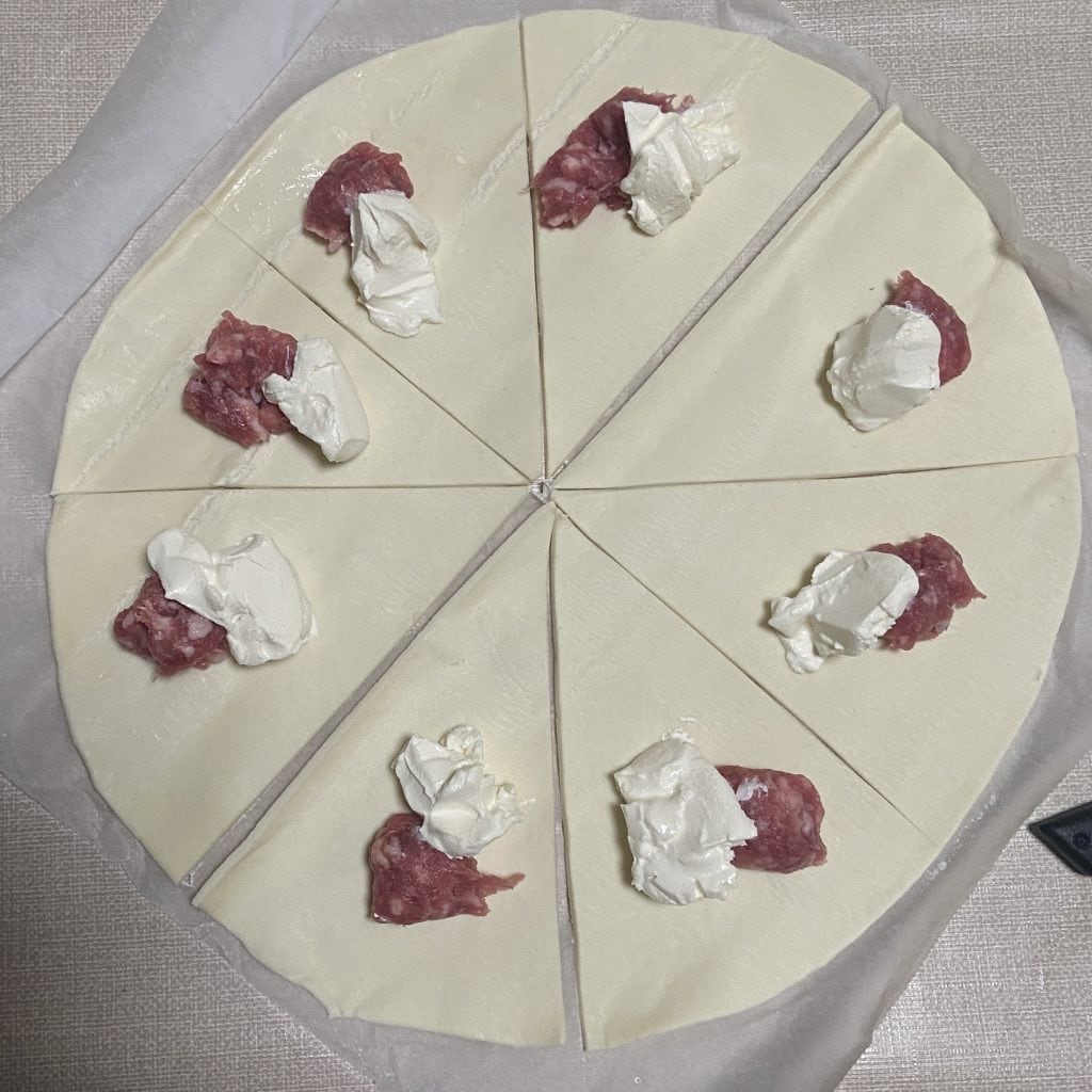 Rol het ronde bladerdeeg uit en gebruik een deegsnijder om 8 stukken te snijden die lijken op pizzapunten