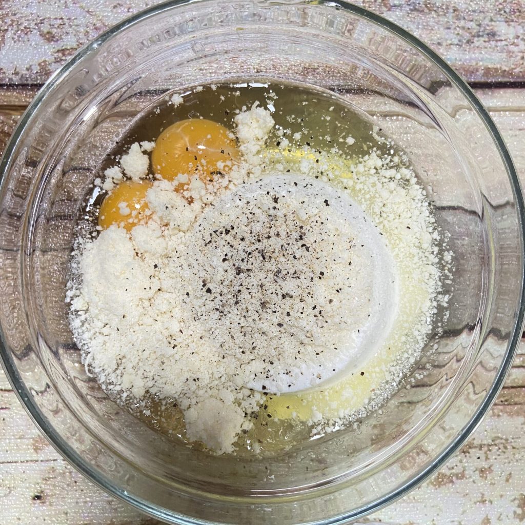 Breek de eieren in een kom. Voeg de ricotta, de geraspte Parmezaanse kaas, zout en peper toe en meng met een garde tot een romig en homogeen beslag.