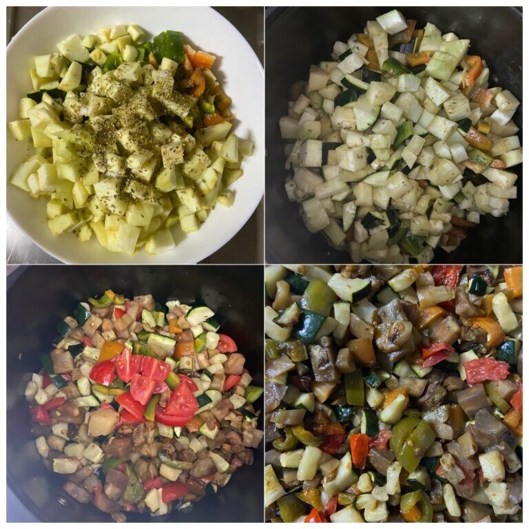 Verzamel alle groenten in een grote kom, voeg extra vergine olijfolie toe, een snufje zout en een mix van kruiden voor gebraad. Meng goed met een lepel of direct met je handen om de dressing gelijkmatig te verdelen.