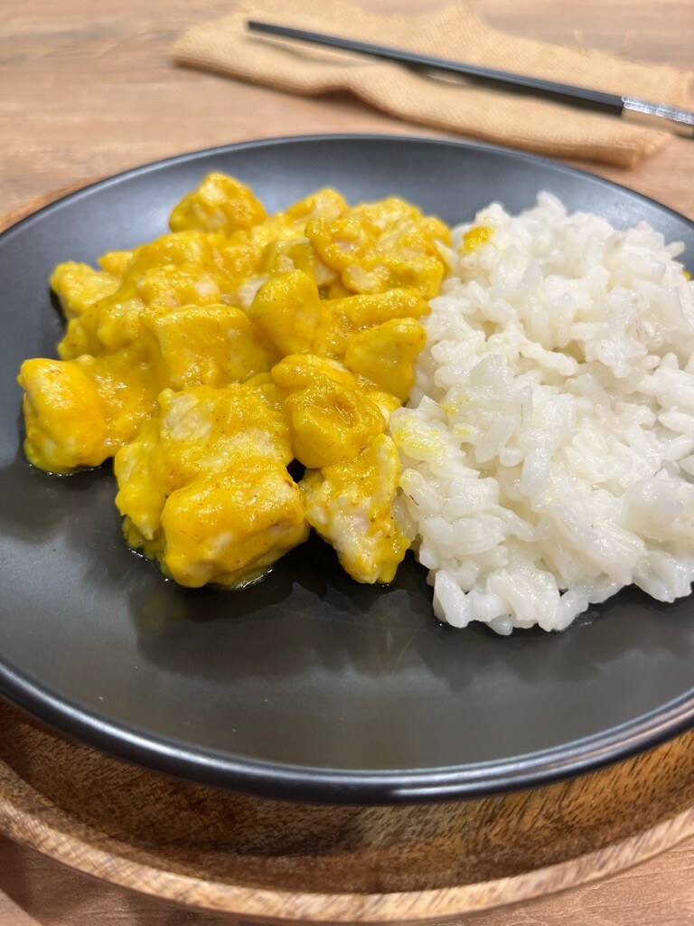 Onze kip curry is klaar. Serveer het warm met de romige witte rijst.