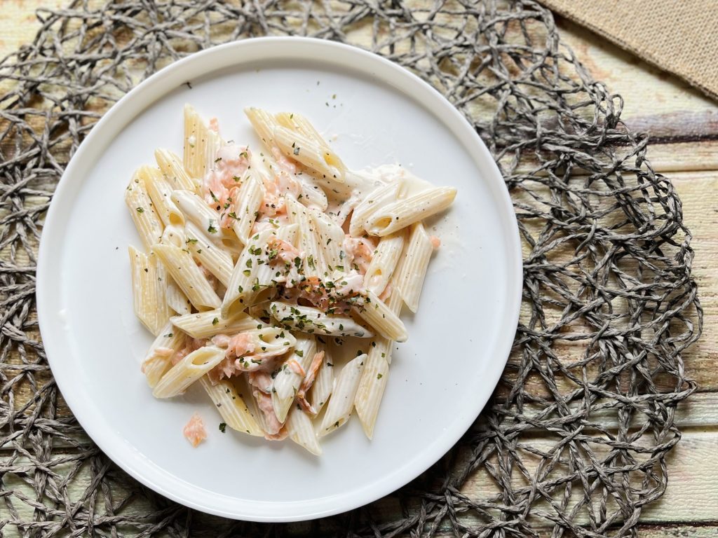 Onze penne met gerookte zalm zijn klaar. Bestrooi het gerecht voor het serveren met verse peterselie of gedroogde.