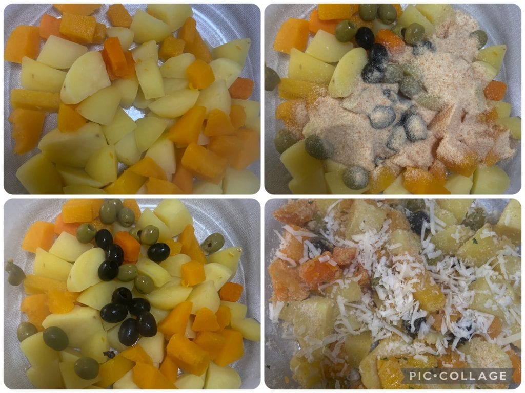 Pompoen met aardappelen en olijven in de airfryer.