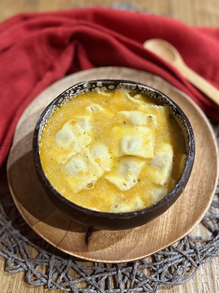 Onze raviolini in romige zelfgemaakte groentebouillon zijn klaar om geserveerd te worden met een druppel rauwe olie en, indien gewenst, een snufje geraspte Parmezaan.