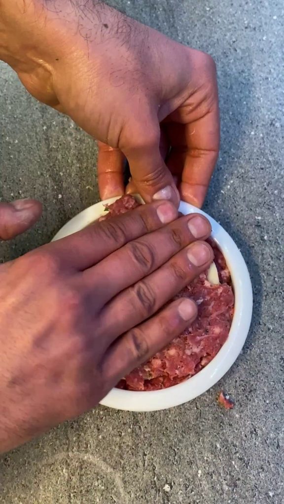Neem op dit punt een hamburgervorm en leg een eerste laag gehakt erin