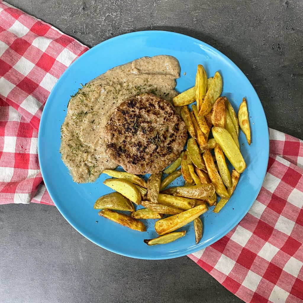 Leg op een bord een bed van paddenstoelencrème, plaats de hamburger bovenop de crème en voeg als bijgerecht de gekookte aardappelpartjes toe. Voeg tenslotte wat peper en bieslook toe.