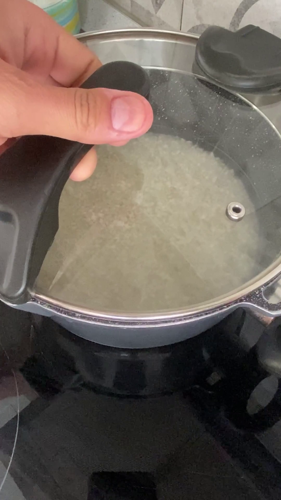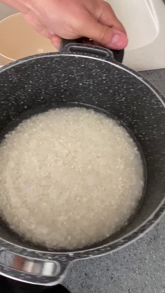 Giet vervolgens de rijst in een pan en bedek deze met water