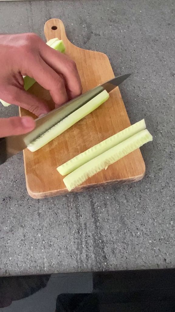 Intussen snijd je de komkommer in reepjes en laat je de tonijn uitlekken om overtollige olie te verwijderen