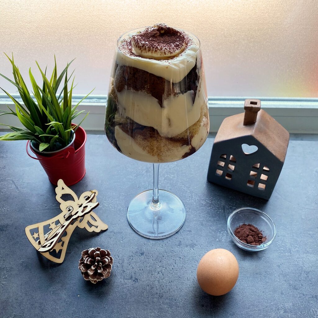 Stel je een dessert voor dat de hele magie van de feestdagen in zich draagt: zachte lagen pandoro, doordrenkt met geurige cacaomelk, omhuld door een romige mascarponecrème, alles geserveerd in een elegant wijnglas of dessertglas, voor een verfijnde en indrukwekkende toets.