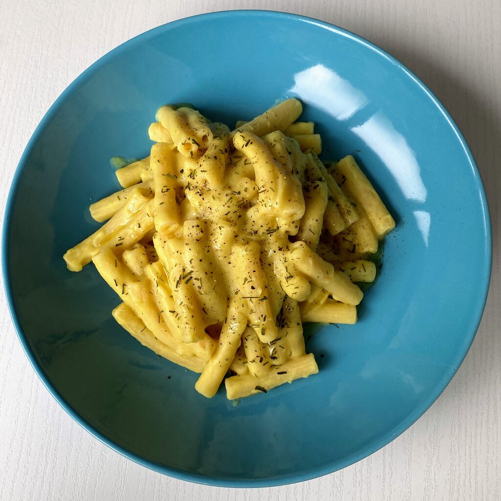 • Om af te maken, garneer de pastaborden met enkele eetlepels van de apart gehouden saus en een snufje peper en bieslook