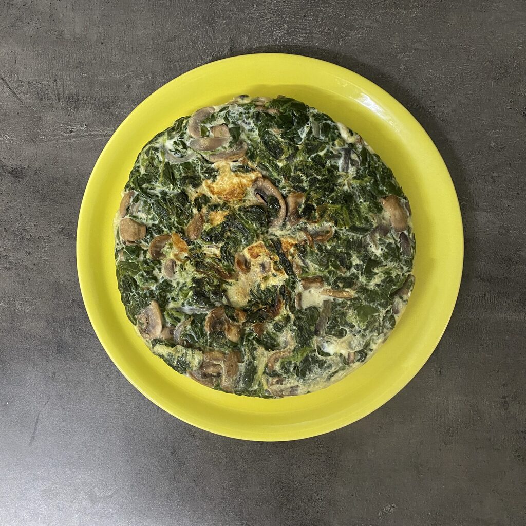 Ik zal je de waarheid vertellen, het zou aanvankelijk een omelet worden, maar ik heb een beetje overdreven met de hoeveelheid spinazie! Geen zorgen echter, want er is een fantastisch alternatief uitgekomen dat net zo lekker is. Ja! Ik heb het taart met spinazie, uien en champignons genoemd om je het idee te geven van iets hoogs en luchtigs om het als een taart te laten lijken.