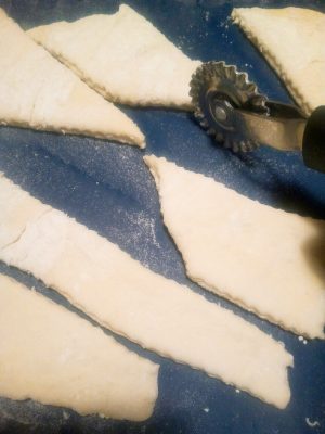 Snijd het deeg vervolgens met een wieltje in ruiten en stroken
