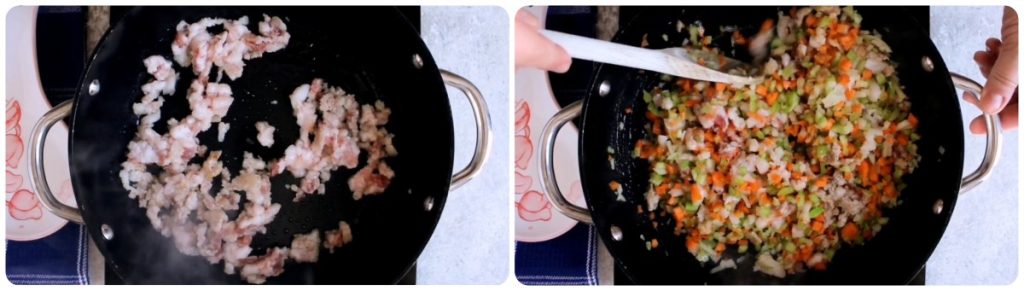 • 3. Verhit een pan van ongeveer 20 cm (of een pan met wat hogere randen) goed, voeg dan de spek toe; maak los met een houten lepel en laat het op middelhoog vuur ongeveer 4 minuten bakken zodat het zijn eigen vet vrijgeeft, waardoor je geen olie hoeft toe te voegen.