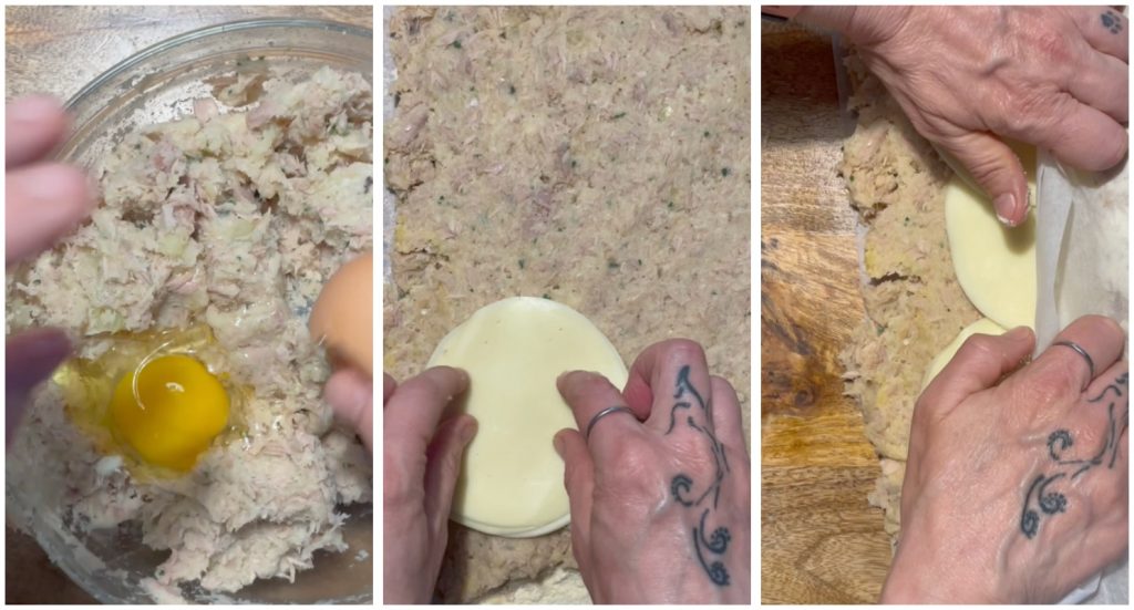 Voeg een ei toe en meng goed. Leg een vel bakpapier neer. Bestrooi het met paneermeel. Verdeel het tonijnmengsel in een rechthoekige vorm. Bedek met plakjes kaas en vorm het gehaktbrood met behulp van het bakpapier. Verwarm de oven voor en bak in een statische oven op 180° gedurende ongeveer 30 minuten.