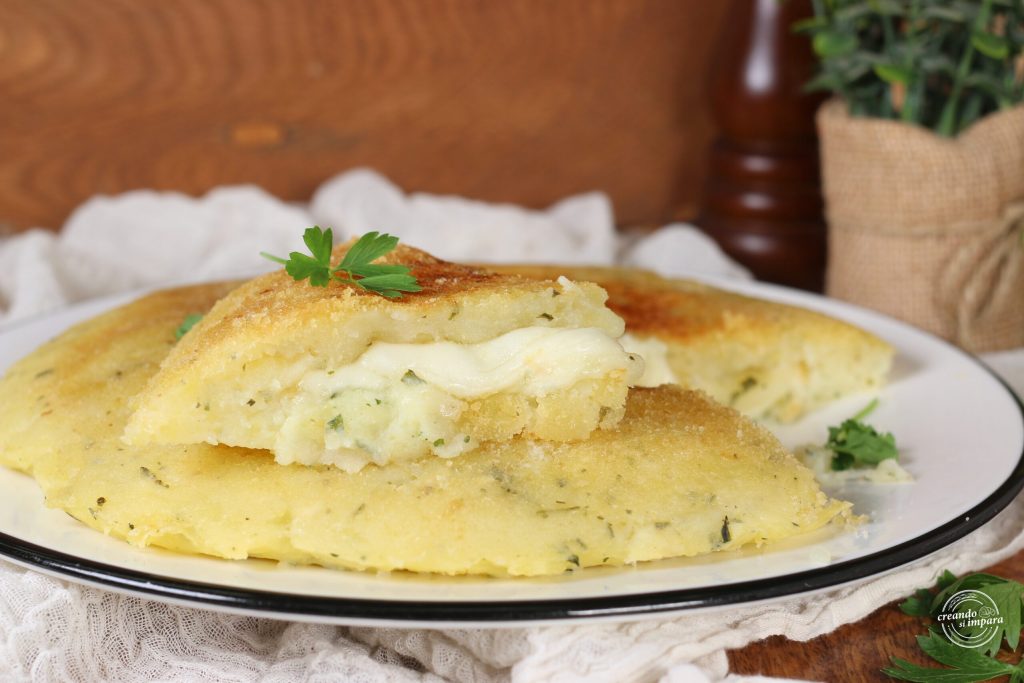 De smeuïge aardappeltaart, een idee dat ontstond nadat ik de Romeinse aardappeltortilla (zonder eieren moet je het proberen, want het is heerlijk) had geprobeerd en nadat ik met Onda, een Romeinse vriendin, had gesproken die me aanraadde om het wit met knoflook en olie te proberen. Ik vind het dan moeilijk om zelfs mijn eigen recepten opnieuw te maken zoals ik ze heb geschreven en moet altijd iets veranderen, dus vulde ik het met kaas die ik in de koelkast had voor tosti’s. Nou, deze aardappeltaart heeft iedereen veroverd, echt onweerstaanbaar. Natuurlijk kun je het vullen met de smeltkaas die je verkiest, zelfs in blokjes.