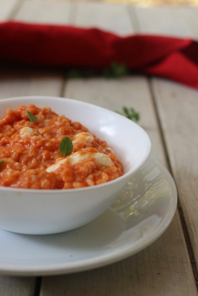 Tomatenrisotto met gesmolten kaas, een verwennerij voor lichaam en ziel, direct gegeten, geurig met oregano, is een genot voor oog en smaakpapillen. Als je het geluk hebt om deze zomer zelfgemaakte tomatensaus te hebben, wordt het een fantastisch gerecht, anders koop een goede tomatenpassata, een beetje geduld om je risotto te roeren tot het gaar is en klaar is kees.