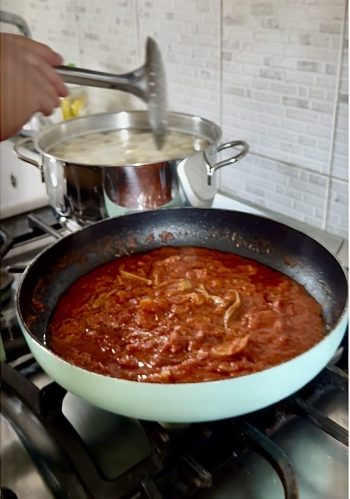 Bereid de saus: fruit de knoflook in een ruime pan met de olie. Voeg de in plakjes gesneden cepes toe en bak ze 5-6 minuten. Als je gedroogde cepes hebt, week ze dan eerst ongeveer 30 minuten in lauwwarm water om ze zacht te maken. Voeg de tomatenpuree toe, zout en peper en laat ongeveer 20 minuten op laag vuur koken.