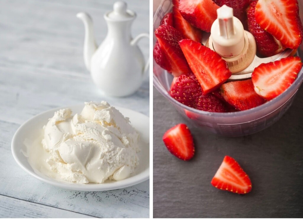 • Bereid de vulling: in een kom werken we de roomkaas met de suiker tot een gladde en schuimige crème. Was en reinig de aardbeien, pureer de helft en bewaar enkele hele voor de uiteindelijke decoratie.