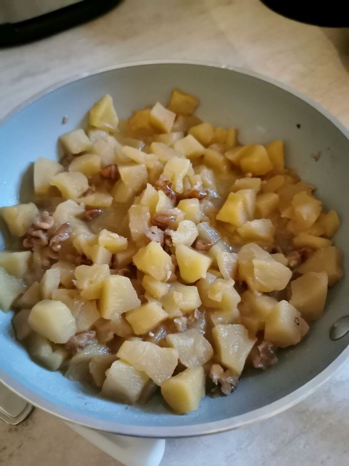 We maken de vulling van de appels. Was en schil de appels en snijd ze in stukjes. Doe alles in een kom en besprenkel met citroensap. Doe de boter, appels, suiker, kaneel en walnoten in stukjes in een pan. Voeg de wijn toe en laat ongeveer 15/20 minuten koken op middelhoog vuur. Haal van het vuur en laat afkoelen.