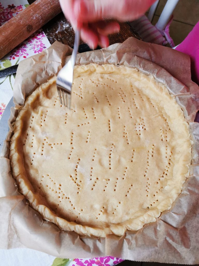 Voor de bereiding van het zanddeeg klik hier. Zodra het uit de koelkast is, rol het deeg uit tot 3 mm dikte en leg het in een ingevette vorm van 28 cm doorsnede. Verwarm de oven voor op 200°, prik gaatjes in de bodem met een vork, bak 5 minuten, verlaag naar 190° en bak nog eens 5/10 minuten, haal uit de oven. Het deeg zal klaar zijn voor verdere bereiding, met de vulling. Laat het afkoelen, intussen bereid je de crème.