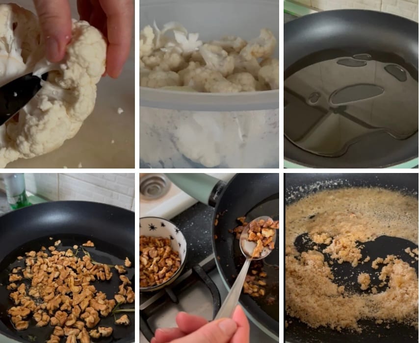 Was de bloemkool grondig en snijd deze in roosjes, die we in gezouten kokend water ongeveer 2/3 minuten leggen, of je kookt ze gestoomd ongeveer 10 minuten. Giet af en zet apart. In een grote pan verwarm je de olie en roosteren we de grofgehakte noten een paar minuten. Haal ze uit de pan en plaats in hun plaats het paneermeel, roosteren we ook het brood een paar minuten, totdat het goudbruin is, zet opzij, net als de noten, in een kom.