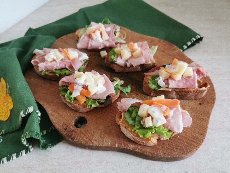 Geweldig op crostini om frisse en enigszins alternatieve combinaties te creëren. Perfect als aperitief of voorgerecht, om van te genieten met vrienden of onverwachte gasten. Snel en heel gemakkelijk te maken, ze zullen bij iedereen in de smaak vallen, ze zijn echt heel lekker. Ik hou erg van voorgerechten, ik hoop u verschillende variëteiten aan te bieden. Hier heb ik naast de peer ook ham en sla gebruikt, maar er kunnen veel variaties zijn, experimenteer