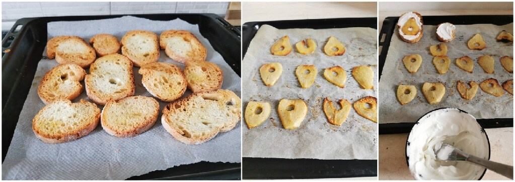 • Laten we beginnen met het voorverwarmen van de oven op 180°. Was de peren en snijd verticale plakjes van 6 mm dik. Verwijder het klokhuis en de zaadjes. Leg de plakjes peer op een met bakpapier beklede bakplaat, bestrijk met het mengsel van gesmolten boter en peper of olijfolie en peper. Bestrijk de peren zowel onder als boven en bak ze 25 minuten in de oven op 180°.