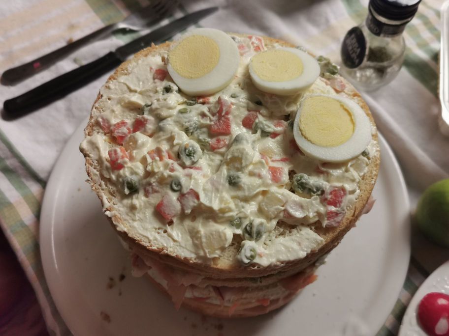 Eenvoudige gastronomische panettone, hartige en verrijkte versie van de traditionele kerstcake. Een kunstwerk uit de jaren zeventig en tachtig, tegenwoordig erg in de mode. Als ze goed zijn voorbereid, zijn ze echt fotogeniek; het is belangrijk om elke laag royaal en fantasierijk te vullen, het zal iedereen bevallen. U kunt ervoor kiezen om het helemaal zelf te maken, inclusief het basisbrood, of het kant-en-klaar te kopen om te serveren, gevuld en al gesneden. Of, zoals ik deed, de basis kant-en-klaar kopen en thuis vullen, ideaal als je het vindt, is de Pan Canasta, een middenweg tussen pan brioche en pan carrè, op basis van bloem, eieren en boter, met een neutrale smaak. Perfect als aperitief of voorgerecht, geniet ervan zoals u het lekker vindt.