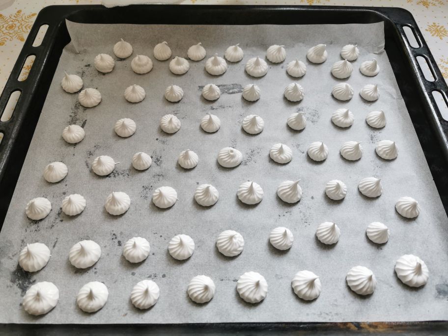 We zijn klaar voor het bakken, de meringues moeten niet gaar worden maar drogen in de oven. Gebruik de statische oven op een temperatuur van 100° om te beginnen, en verlaag na ongeveer 20 minuten tot 90°. Bak ongeveer 1 uur en 15 minuten, controleer af en toe, en als je scheurtjes ziet, verlaag de oven tot ongeveer 80°.