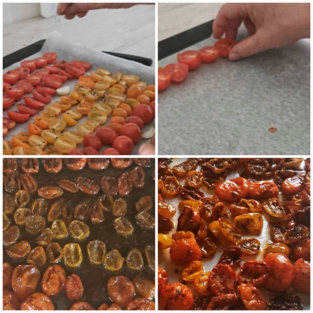 Ik ontdekte per toeval de gekonfijte kersentomaten, en was meteen verkocht. Heerlijke gekarameliseerde tomaten uit de oven met een unieke smaak. Ze kunnen een perfect voorgerecht zijn, maar worden ook veel gebruikt in talloze recepten. De term confit komt van het Franse confire, dat wil zeggen conserveren. Deze term wordt gebruikt voor alle soorten fruit en groenten die een lange kooktijd op lage temperatuur vereisen. Gemakkelijk te bereiden, heerlijk om te eten. Perfect als bijgerecht, gecombineerd met bruschetta, hartige taarten, of zo natuurlijk