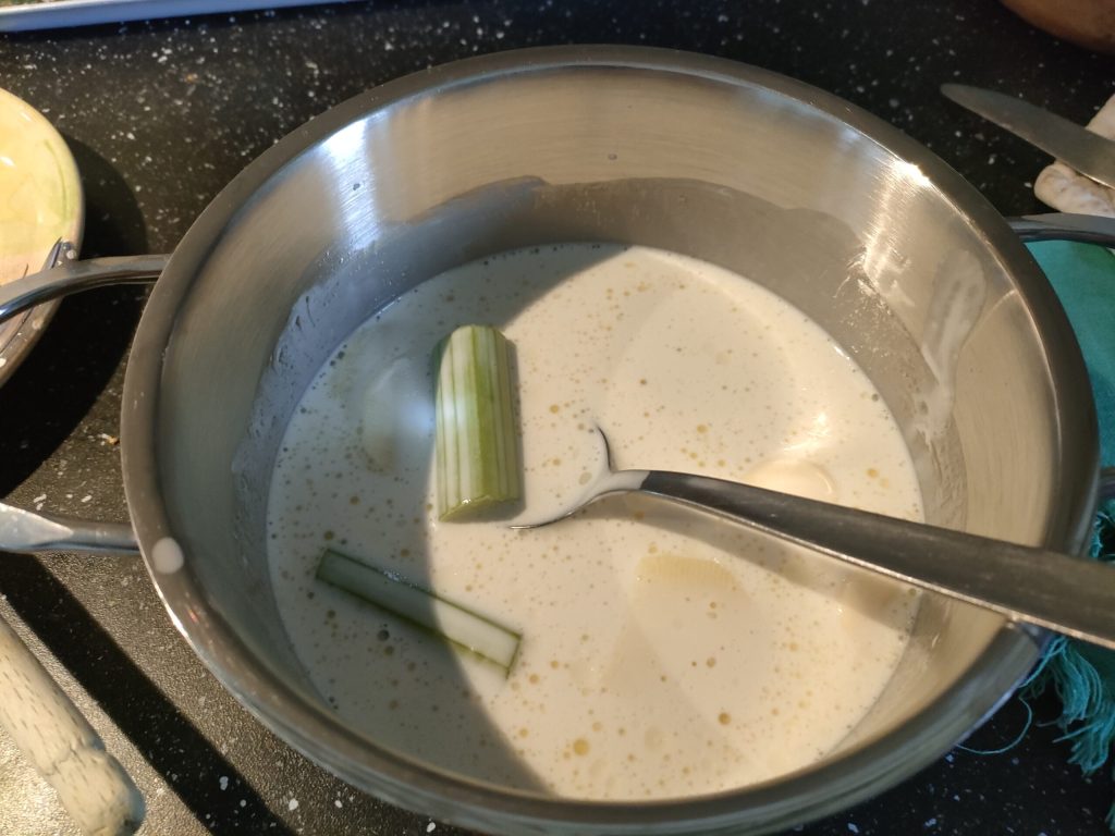 Schil de aardappel en snijd deze in plakjes. Breng ze op smaak in een pan met een beetje olie, voeg vervolgens de melk en room toe, de selderij, het laurierblad en het gepelde teentje knoflook zonder kern. Kook ongeveer 10 minuten