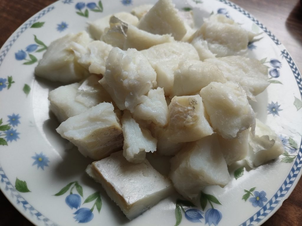 Verwijder de huid van de kabeljauw en snijd hem in stukjes. Verwijder de graten met de speciale pincet