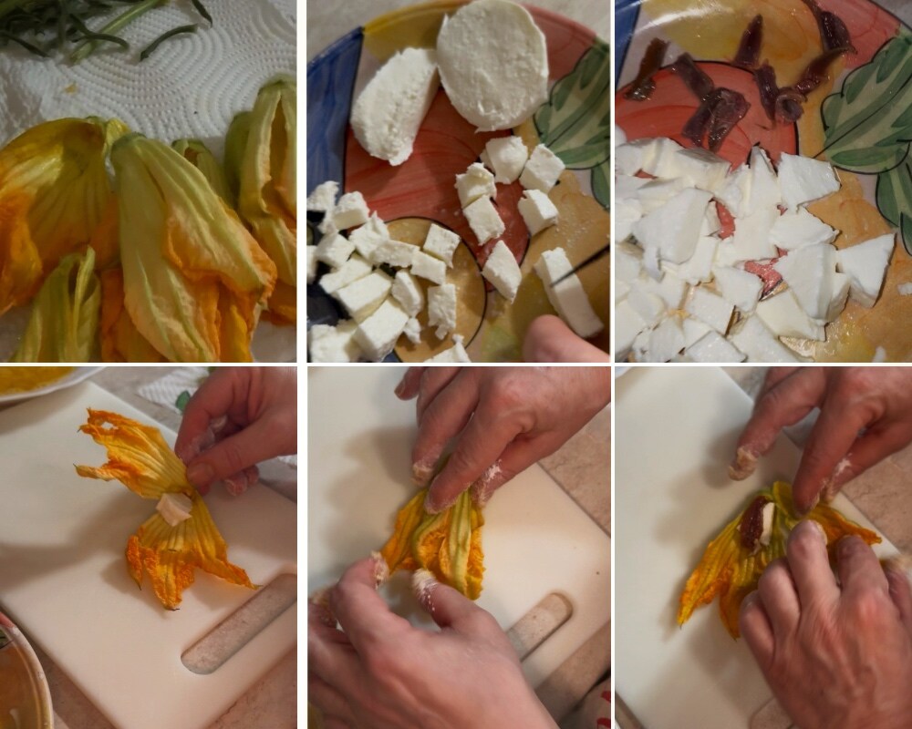 Vul de bloemen: Open elke bloem voorzichtig en plaats een stukje mozzarella en een halve ansjovisfilet erin. Sluit de bloemblaadjes voorzichtig om de vulling af te sluiten.Bereid de paneermeel voor: Klop in een kom de eieren met een snufje zout. Doe in een andere kom het paneermeel