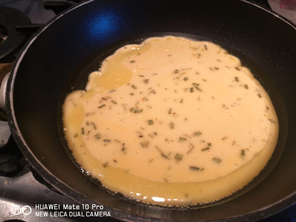 Bereid twee omeletten: klop in een kom het ei met een vork, breng op smaak met zout en peper, voeg een theelepel kruidenmix voor gebraad toe, een halve eetlepel bloem, meng goed en kook in een kleine antiaanbakpan met een beetje olie. Herhaal het proces voor de tweede omelet.
