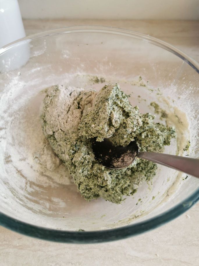 We bereiden de vulling voor de tagliatelle. Was en blancheer de spinazie ongeveer 8 minuten, als ze klaar zijn, giet ze af, knijp ze goed uit met je handen en hak ze fijn met een mezzaluna. Doe de ricotta, de spinazie, de kaas, het ei, zout en peper in een grote kom. Meng alles goed en zet in de koelkast.