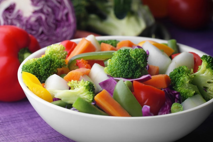 Kook alle groenten, de zilveruitjes, selderij en bloemkool in dezelfde pot in gezouten kokend water gedurende ongeveer 2 minuten tot ze beetgaar zijn. Kook de sperziebonen en wortelen apart in een andere pan. Laat ze daarna uitlekken met een schuimspaan en laat ze drogen op een theedoek.