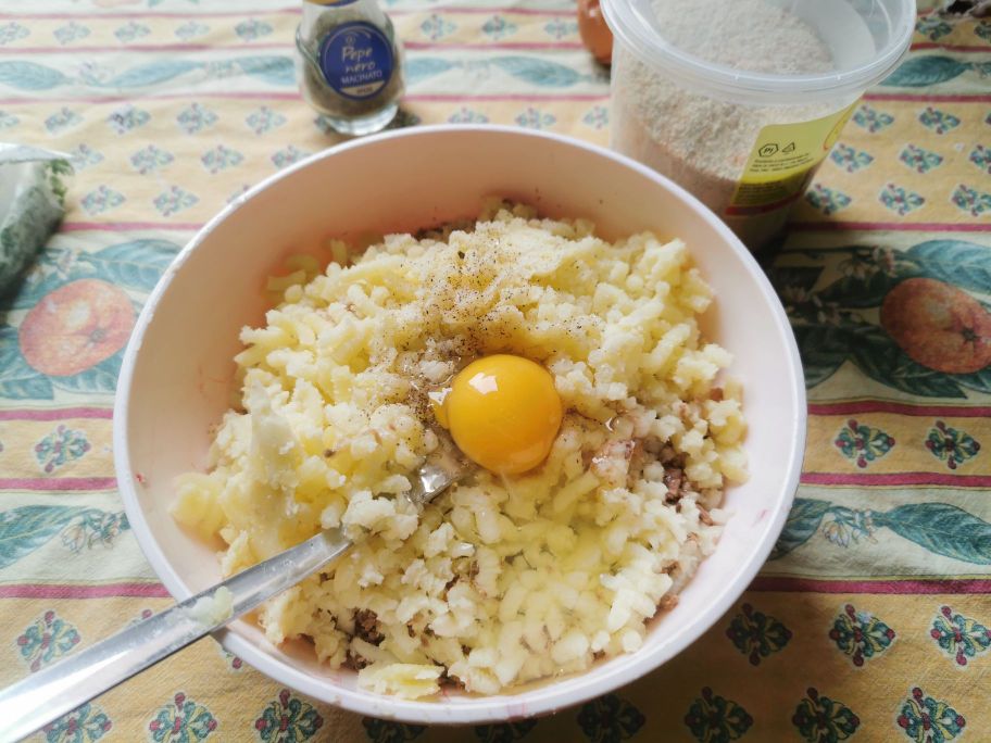 Op dit punt voeg je zout, peper, de eieren en de fijngehakte groenten, en de Parmigiano Reggiano toe