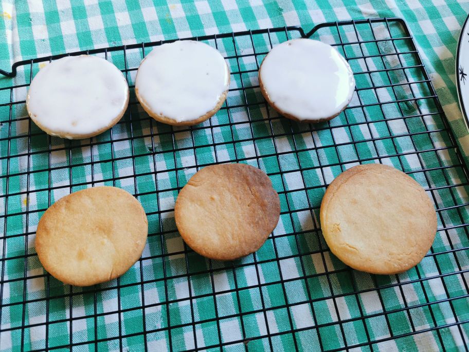 Wanneer de koekjes klaar en koud zijn, bedek je het oppervlak van de koekjes met het glazuur met een spuitzak of een lepel, probeer binnen de randen te blijven. Laat het glazuur uitharden, dit duurt minstens een paar uur