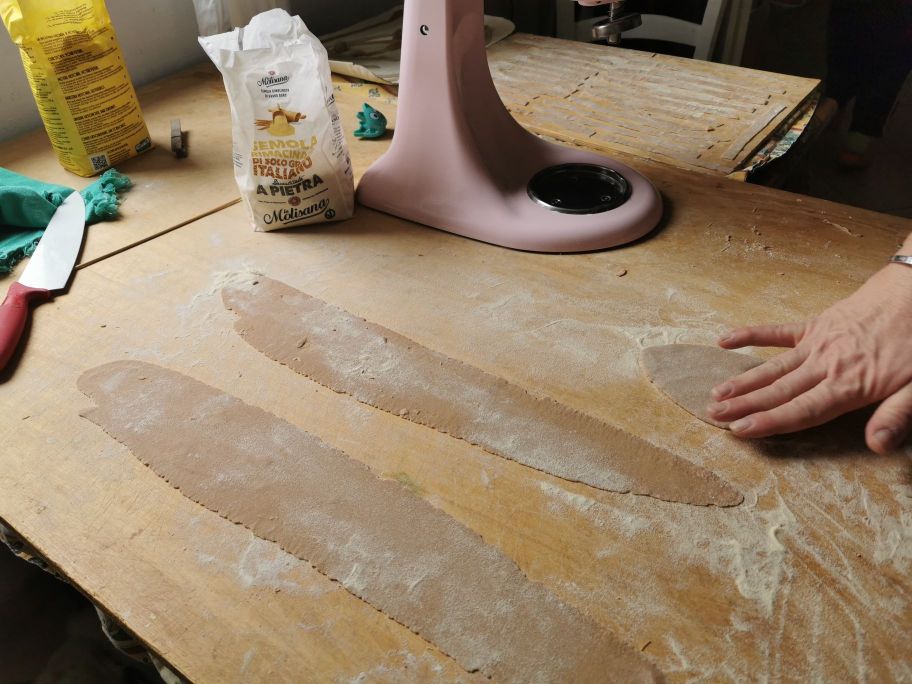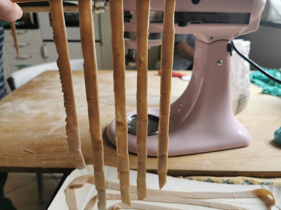 • Bereiding pasta: Doe het kastanjemeel en de bloem 00 in een kom, meng. Maak een kuiltje in het midden, voeg de eieren en een snufje zout toe, begin met de handen te kneden, zodra het deeg begint te vormen, verplaats alles naar een houten plank, kneed enkele minuten tot je een gladde en homogene bal krijgt, wikkel het in een doek en laat rusten. Dit alles kun je ook gemakkelijk doen in een deegmachine (in mijn geval een roze Kitchenaid, zoals te zien op de foto)