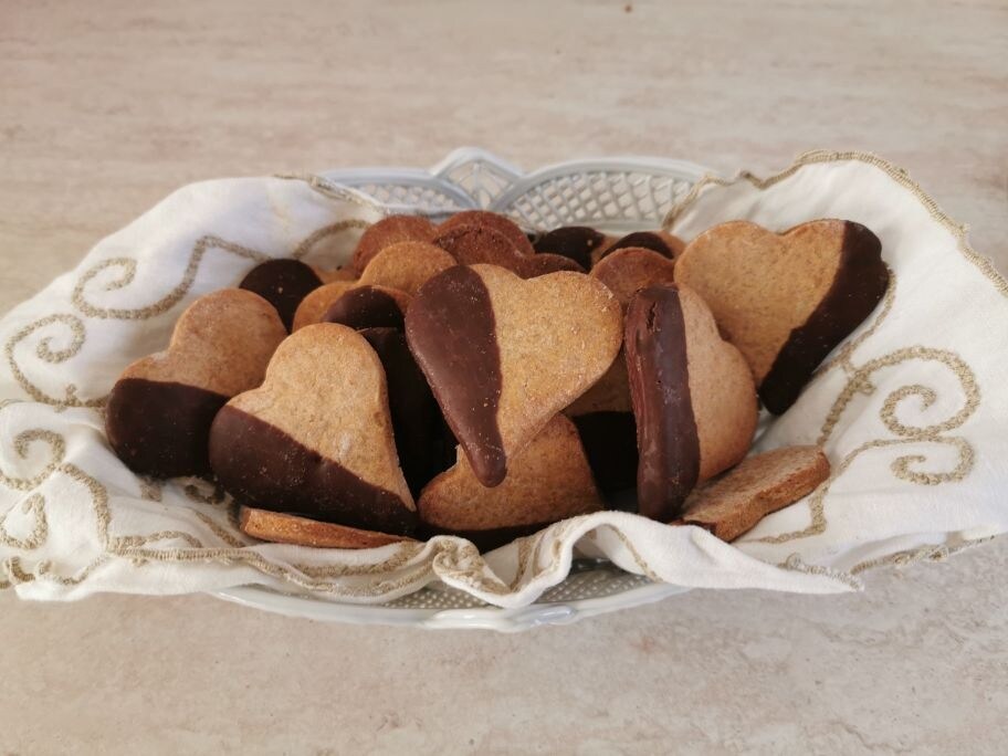Laat ze na het bakken afkoelen op een koelrooster. Hak intussen de chocolade grof en smelt deze au bain-marie, zodra deze gesmolten is, doop je een koekje per keer in de gesmolten chocolade en leg je ze op een vel bakpapier om af te koelen.