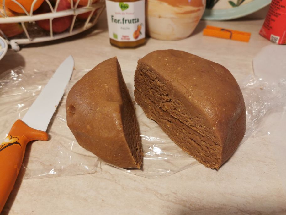 Zeef de meelsoorten in een kom en meng ze met de suiker en het bakpoeder, voeg de zachte boter in stukjes toe. Werk alles met de handen tot een kruimelige massa, voeg de eieren één voor één toe en voeg de rum toe. Vorm een bal en wikkel deze in vershoudfolie, laat ongeveer 30 minuten in de koelkast rusten.