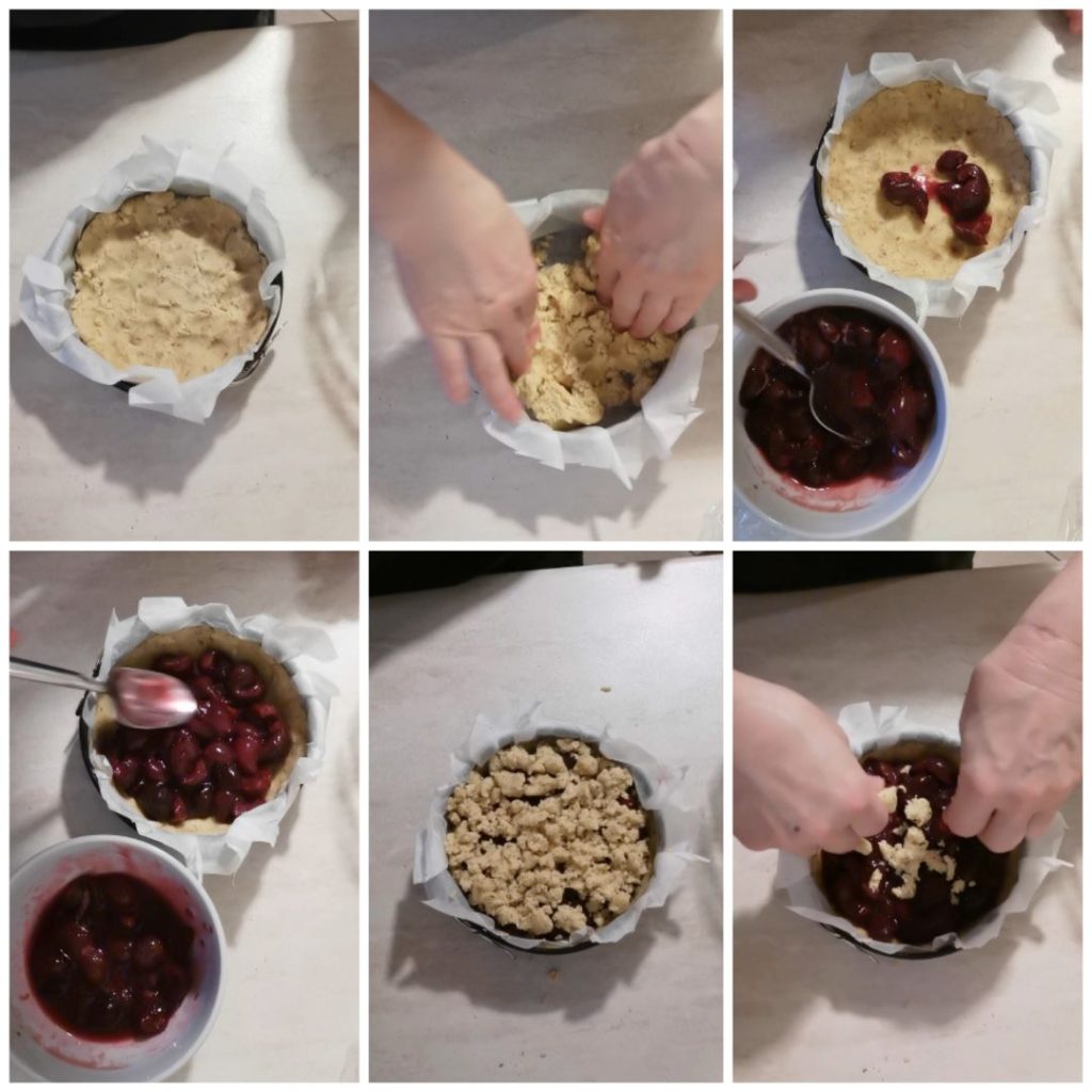 Verwarm de oven voor op 180°. Bekleed een bakvorm met bakpapier en leg de helft van de kruimelige deeg erin met de handen. Voeg dan de kersen toe en bedek ze met een laag kruimels van het resterende deeg. Bak in een warme, statische oven in het midden van de oven gedurende ongeveer 30 minuten, of totdat de bovenkant goudbruin is. Haal uit de oven en laat minstens 2 uur afkoelen in de vorm voordat je het serveert