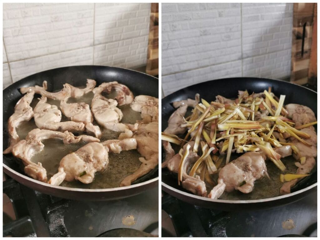 Verhit intussen in een grote pan de knoflook in een scheutje olijfolie, voeg de rozemarijn en het konijn toe en bak het goed aan alle kanten. Blus het vlees af met de wijn en voeg, zodra het is verdampt, de artisjokken toe. Zet het vuur laag en dek de pan af met een deksel.