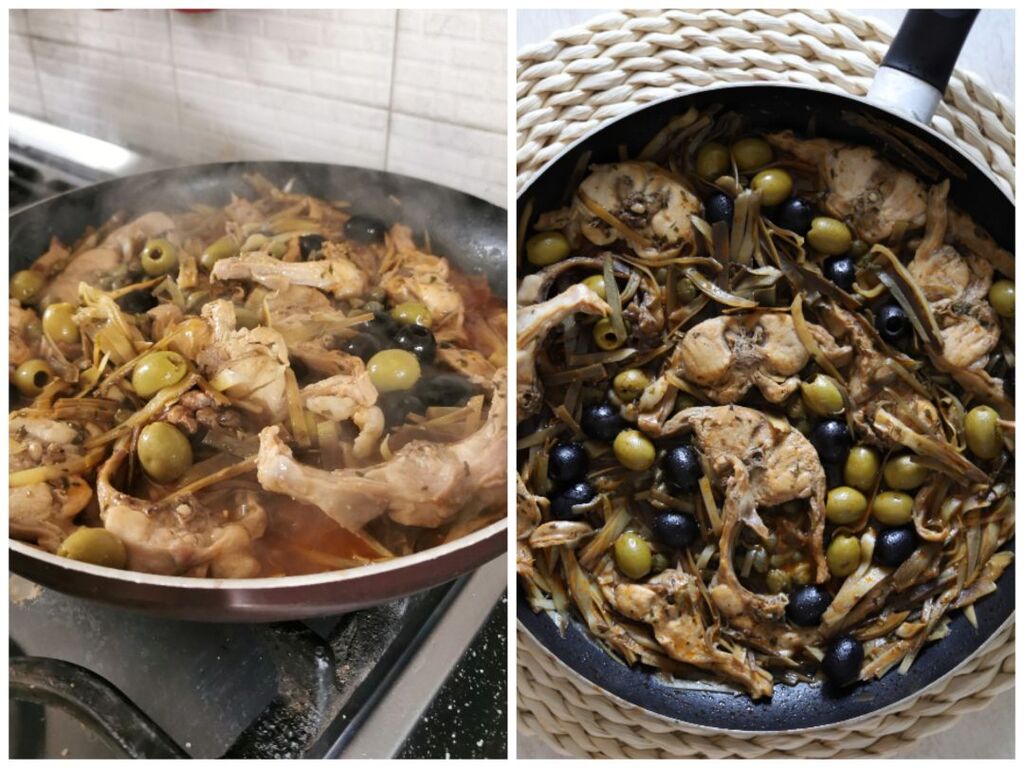 Kook het konijn ongeveer 50 minuten, voeg indien nodig enkele lepels groentebouillon of water toe. Voeg 10 minuten voor het einde van de kooktijd de olijven toe en breng op smaak met zout en peper.