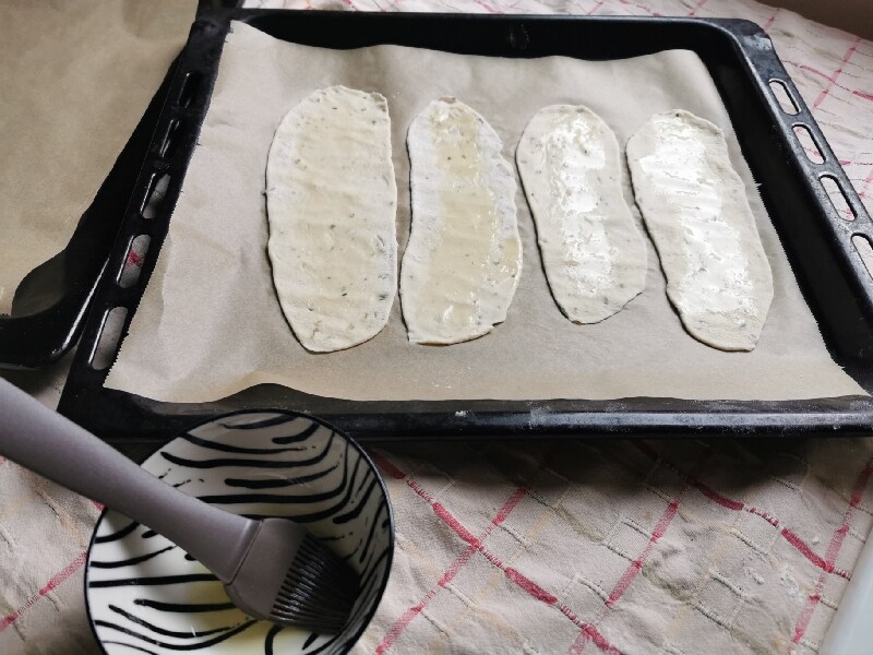 Breng de flinters over naar een bakplaat. Smeer een beetje extra vergine olijfolie op het oppervlak van de flinters. Bak in een voorverwarmde statische oven op 250°, in het onderste deel van de oven voor ongeveer 4 minuten, er zullen bijna onmiddellijk bellen ontstaan. Verplaats het dan meteen naar het bovenste rek en laat nog eens 2 minuten bakken.