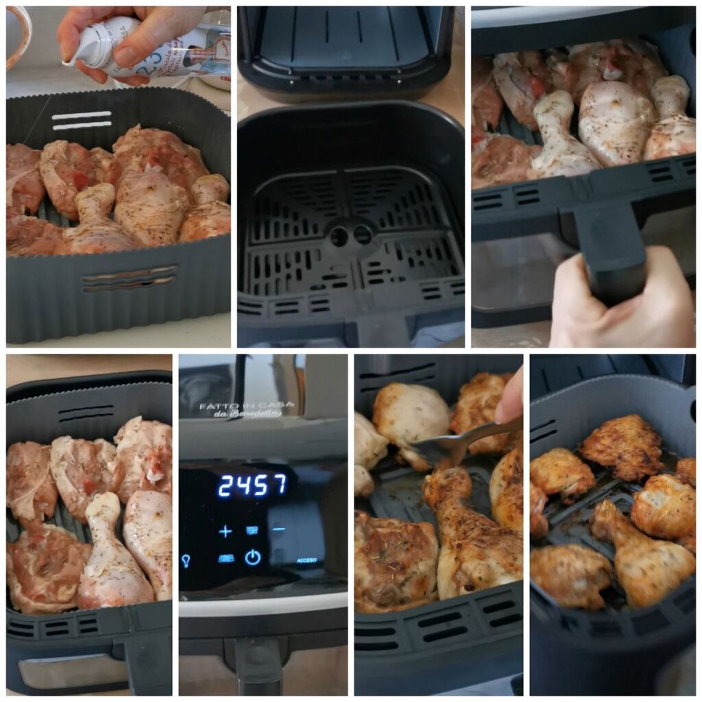 De kippenbouten en dijen in de heteluchtfriteuse zijn een eenvoudig, snel en smakelijk gerecht, perfect voor een diner met familie of vrienden. Dankzij zijn veelzijdigheid is de heteluchtfriteuse een onmisbaar apparaat geworden in veel keukens, dankzij zijn vermogen om voedsel een geweldige krokante buitenkant en een zachte binnenkant te geven.