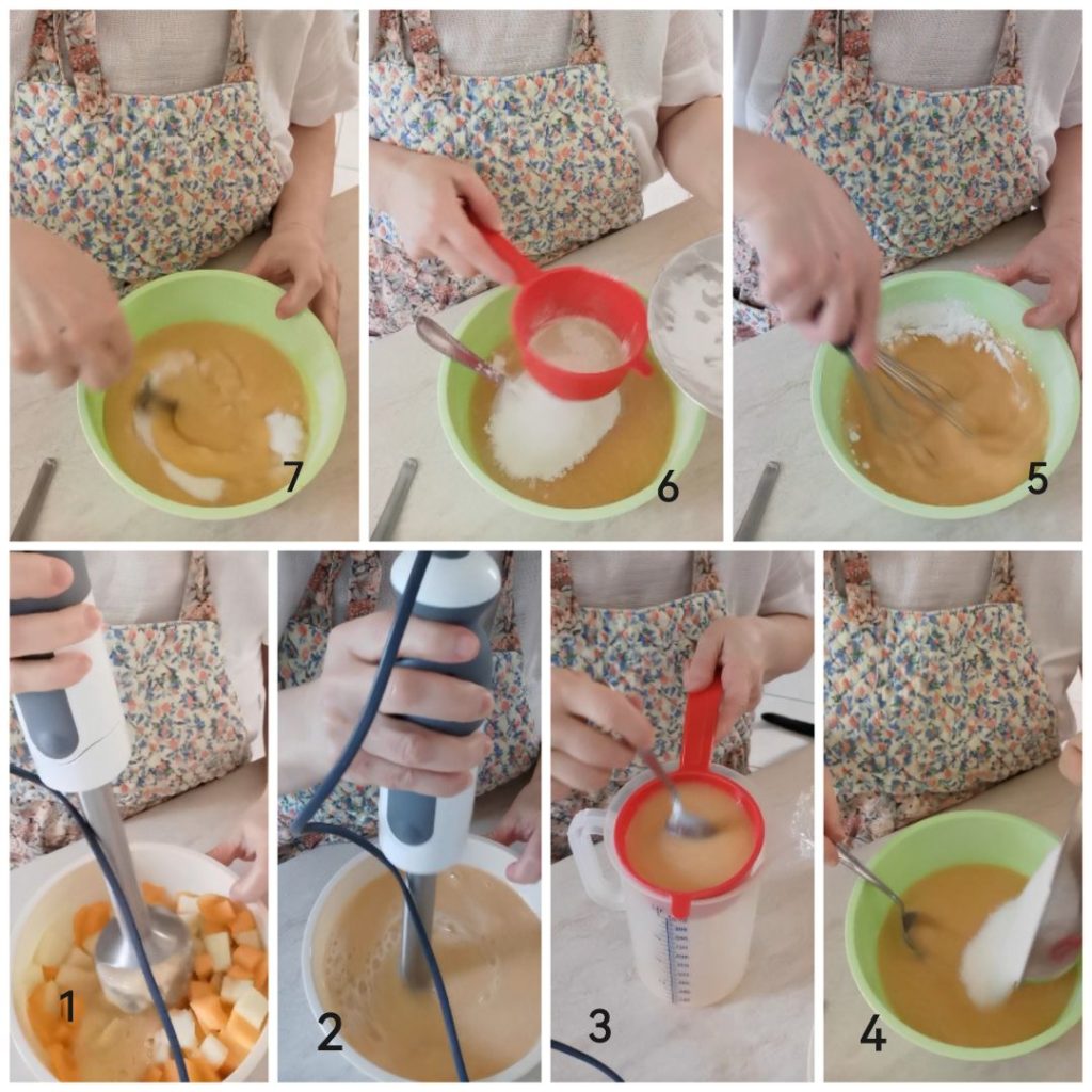 Snijd de meloen, verwijder de zaden, pureer het vruchtvlees met een staafmixer, (als je interesse hebt in de aankoop klik hier) tot een fijne puree, zeef het om wat vloeistof eruit te krijgen. Doe in een kom, voeg het aardappelzetmeel en de suiker toe, meng alles, de meloencrème is klaar