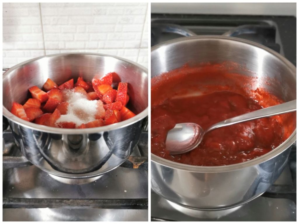 We wassen en snijden de aardbeien in stukjes, houden er een paar apart om als decoratie te gebruiken. Doe ze in een pannetje waarin we de suiker en het citroensap toevoegen. Kook op middelhoog vuur, ongeveer 15 minuten, tot er een soort jam ontstaat. Zet dan uit en laat afkoelen.